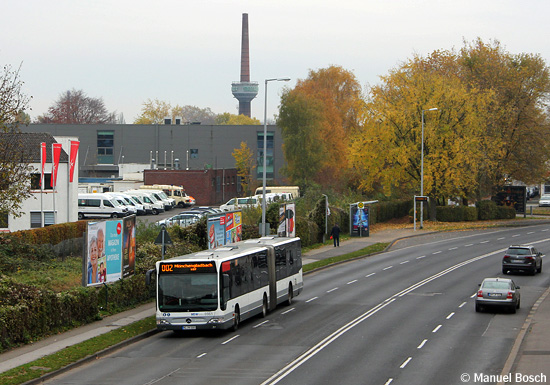 Herbstlich bunt die Blätter, herbstlich grau das Wetter - und sonntäglich leer die Theodor-Heuss-Straße: Vor der Kulisse des Monforts-Schornsteins ist der EvoBus MB O 530 G (Citaro) mit der Wagennummer 0961 der Mönchengladbacher NEW am 17.11.2019 als Linie 002 von Rheydt kommend unterwegs zum Mönchengladbacher Hauptbahnhof.