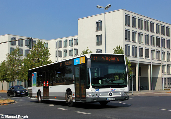 Für weitere EvoBus MB O 530 (Citaro) der Facelift-Bauform sind bei der Mönchengladbacher NEW nun die letzten Einsatzwochen angebrochen. Zu den Ausmusterungskandidaten zählt auch der Wagen 0901, der am 03.08.2018 vor der Kulisse des neuen Finanzamts nahe der Haltestelle Nordpark Busbahnhof im Bild festgehalten wurde.