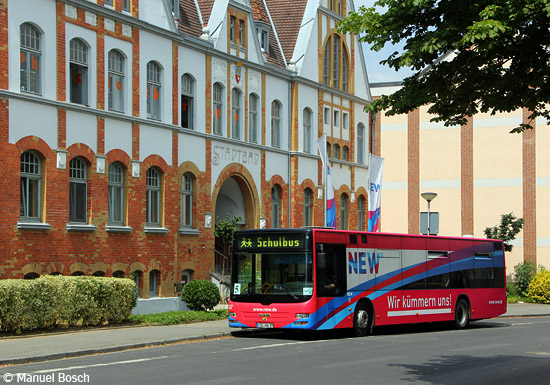 Die NEW führt in Mönchengladbach und in Viersen auch Sport- und Bäderfahrten für Schulen durch, die allerdings derzeit Corona-bedingten Einschränkungen unterliegen. Vor der Kulisse des Viersener Stadtbads wartete am 05.07.2019 der Wagen 37 der Viersener NEW, ein kurz darauf ausgemusterter MAN A21 (NL 273 Lion's City), auf eine zurückkehrende Schulklasse.