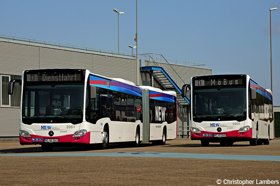 Die NEW hat die 17 diesjährigen Neufahrzeuge - davon 15 für Mönchengladbach und zwei für Viersen - in Betrieb genommen. Von den Mönchengladbacher Neuwagen präsentieren sich im Bild von Christopher Lambers der EvoBus MB O 530 C2 Hybrid (Citaro) mit der Nummer 2005 und der EvoBus MB O 530 G C2 Hybrid (Citaro) mit der Nummer 2061 auf dem Betriebshof.