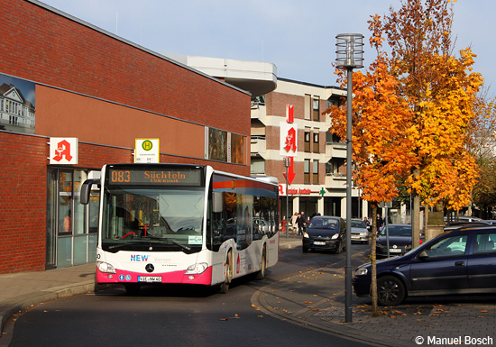 Nicht nur mit dem frühen Einbruch der Dunkelheit, sondern auch mit der Färbung der Blätter an den Bäumen macht sich der Herbst in diesen Wochen deutlich bemerkbar. Die Klinkersteine des Löh-Centers reihen sich farblich passend ein, als der EvoBus MB O 530 C2 (Citaro) mit der Wagennummer 40 der Viersener NEW am 16.11.2019 die Haltestelle Gartenstraße verlässt.