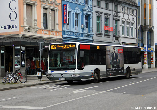 Für die noch verbliebenen EvoBus MB O 530 (Citaro) des Baujahres 2010 der Mönchenglad- bacher NEW - und damit die letzten Vertreter ihrer Bauart im Bestand - brechen die finalen Einsatzwochen an, steht doch in diesem Sommer ihre Ausmusterung bevor. Am 17.11.2019 war Wagen 1004 am Marienplatz in Rheydt als Linie 004 unterwegs.
