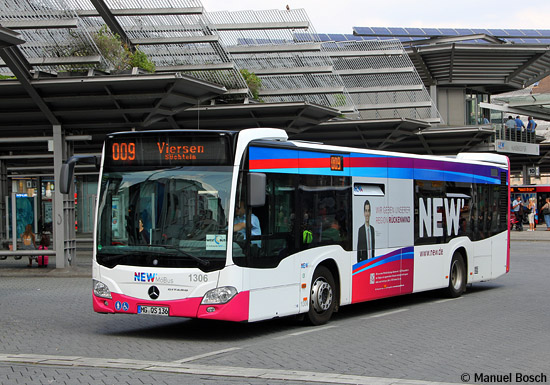 Im Jahr 2013 wurden erstmals Linienbusse mit Motoren der Abgasnorm Euro VI beschafft. Nach zwei Jahren Abstinenz konnte sich Mercedes-Benz in diesem Jahr wieder durchsetzen und lieferte sein rundum überarbeitetes Modell Citaro C2 an den linken Niederrhein. Die NEW Mönchengladbach reihte neben Gelenkbussen auch acht Solowagen unter den Nummern 1301 bis 1308 in den Bestand ein. Der als Wagen 1306 geführte EvoBus MB O 530 C2 (Citaro) verlässt im Bild vom 01.08.2014 den Mönchengladbacher Hauptbahnhof.