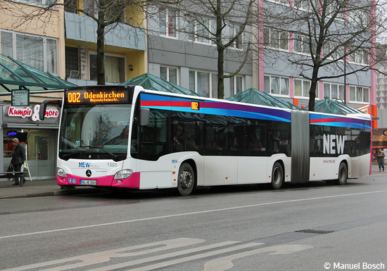 Als Wagen 1561 bis 1567 sind die sieben Gelenkbusse des Typs EvoBus MB O 530 G C2 (Citaro) in den Bestand eingereiht. Wagen 1565 war am trüben 23.01.2016 am Marienplatz in Mönchengladbach-Rheydt als Linie 002 auf dem Weg nach Odenkirchen.