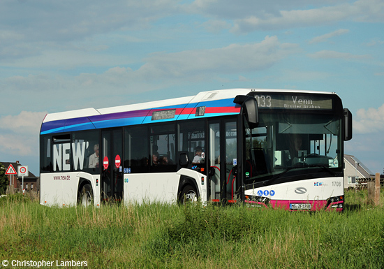 Für das Jahr 2017 sicherte sich Solaris erneut den Auftrag der Ausschreibungsgemeinschaft Mittlerer Niederrhein. Die Mönchengladbacher NEW stellte weitere 16 Solowagen und vier Gelenkbusse des vom Vorjahr bekannten Baumusters in Dienst. Allerdings wurde die gesamte Serie mit einem Automatikgetriebe von ZF statt der bis dahin verwendeten Getriebe von Voith ausgestattet. Von den als Wagen 1701 bis 1716 eingereihten Solaris Urbino 12 konnte Christopher Lambers den Wagen 1708 am 09.08.2017 nahe der Haltestelle Rönneter Ring im Bild festhalten.