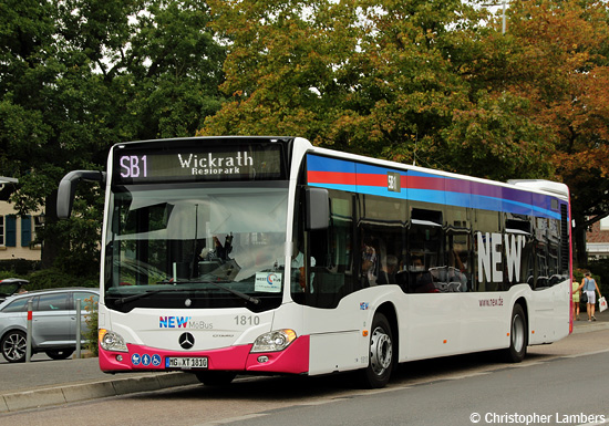 Da Solaris den vorgesehenen Liefertermin nicht einhalten konnte, erhielt Mercedes-Benz den Aufrag für das Jahr 2018. Mit 13 Solowagen und 15 Gelenkbussen handelt es sich um die größte Beschaffung für Mönchengladbach seit dem Jahr 1985. Von der Lieferung der typgleichen Fahrzeuge des Jahrgangs 2015 unterscheiden sich die Busse durch die Ausstattung mit WLAN-Zugängen für die Fahrgäste, die weiß leuchtenden LED-Zielanzeigen - deren Liniennummernfeld erstmals mehrfarbig zur orangenen Anzeige des Schulbussymbols ausgeführt wurde -, das Kurvenfahrlicht und eine Einstiegsbeleuchtung unterhalb der Türen. Von den als Wagen 1801 bis 1813 geführten EvoBus MB O 530 C2 (Citaro) wurden die Wagen 1801 bis 1806 mit einem Getriebe von Voith, die übrigen mit einem solchen von ZF ausgerüstet. Christopher Lambers konnte den Wagen 1810 am 08.08.2018 in Wickrath am Markt aufnehmen.