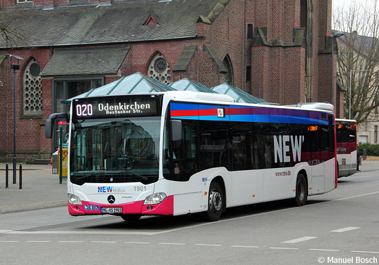 Auch der Auftrag für das Lieferjahr 2019 ging an Mercedes-Benz, wobei nach Mönchengladbach 13 Solowagen und neun Gelenkbusse geliefert wurden. Wesentliche technische Änderung gegenüber dem Vorjahr ist die Ausstattung mit einem Mildhybrid-Modul: Dabei ist ein kleiner Elektromotor zwischen Dieselmotor und Automatikgetriebe eingebaut und erzeugt beim Bremsen als Generator Strom, der in Doppelschichtkondensatoren ("Supercaps") gespeichert wird. Beim Anfahren wird aus den Kondensatoren der Elektromotor mit Strom angetrieben und unterstützt den Dieselmotor, während ein rein elektrischer Betrieb nicht möglich ist. Äußerlich ist das Mildhybrid-Modul durch einen zusätzlichen Dachaufbau am Heck erkennbar. Außerdem wurden die Fahrzeuge erstmals mit einer Vollklimatisierung ausgestattet. Die übrigen Ausstattungsmerkmale entsprechend weitgehend den Fahrzeugen des Jahrgangs 2019. Die 13 EvoBus MB O 530 C2 Hybrid (Citaro), die ein Voith-Getriebe aufweisen, wurden als Wagen 1901 bis 1913 eingereiht. Wagen 1901 konnte am 17.11.2019 am Marienplatz in Rheydt aufgenommen werden, erkennbar ist die große Haube der Klimaanlage im vorderen Dachbereich.
