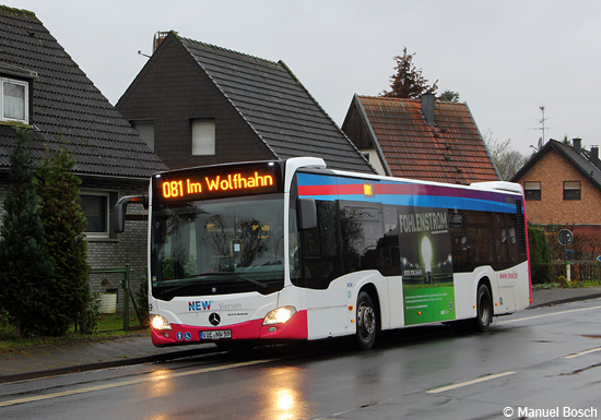 Zwei weitere EvoBus MB O 530 C2 (Citaro) mit Euro VI-Motor gelangten im Sommer 2014 in den Bestand der Viersener NEW, die als Wagen 58 und 59 bezeichnet wurden. Die Fahrzeuge sind mit den Wagen der Vorjahreslieferung nahezu identisch. Am 15.12.2014 hat Wagen 59 an der Haltestelle Hammer Schanze sein Fahrtziel fast erreicht.