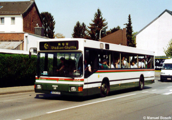 Nur einen einzigen eigenen MAN NL 202 in der ersten Version mit durchgehenden Podesten im Innenraum sowie gerader Fensterkante hatte die NVV im Bestand, der zudem bereits im Jahre 2003 ausgemustert worden war - mit den fünf Leihwagen kehrte somit ein für Mönchengladbach ungewöhnlicher Fahrzeugtyp zur NVV zurück. Ebenfalls als Shuttlebus zum Stadion, aber mit abweichender Zielbeschilderung im Vergleich zum vorherigen Bild war der Wagen 0554 am 06.05.2006 an der Haltestelle Engelsholt unterwegs. | |