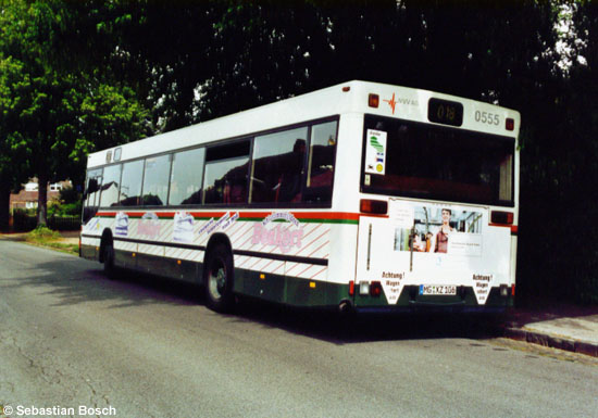 Die fünf Leihwagen behielten bis zur Abstellung und Rückgabe im Juni 2006 ihre Original-lackierung und -werbungen. Neben der auf allen Fahrzeugen angebrachten Heckwerbung der Stadtwerke Augsburg verfügte der Wagen 0555 dabei über eine Bandenwerbung für einen Schlafzimmerausstatter im Raum Augsburg. Die Heckaufnahme zeigt dieses Fahrzeug am 15.05.2006 nahe der Haltestelle Meerkamp Kirche vor einem Einsatz auf der Linie 018. | |