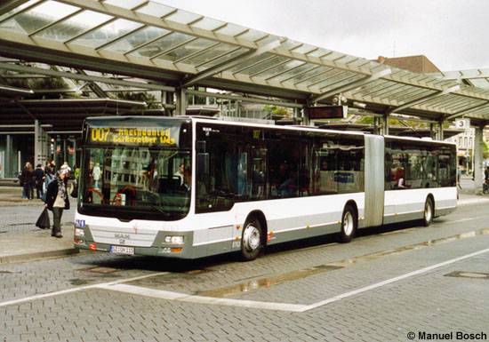 Vollständig in NVV-Ausstattung und - mit Ausnahme des roten Balkens an der Dachkante - auch entsprechender Lackierung stellte MAN im Sommer 2007 einen MAN A23 (NG 313 Lion's City) als Leihwagen zur Verfügung. Der Gelenkbus wurde auf das Kennzeichen SZ-GN 115 zugelassen, erhielt allerdings die reguläre Wagennummer 0763. Zum Jahresbeginn 2008 ging das Fahrzeug unter dem neuen Kennzeichen MG-YA 110 in den Bestand der NVV über. Noch als Leihwagen wurde es am 18.09.2007 am Mönchengladbacher Hauptbahnhof abgelichtet. | |