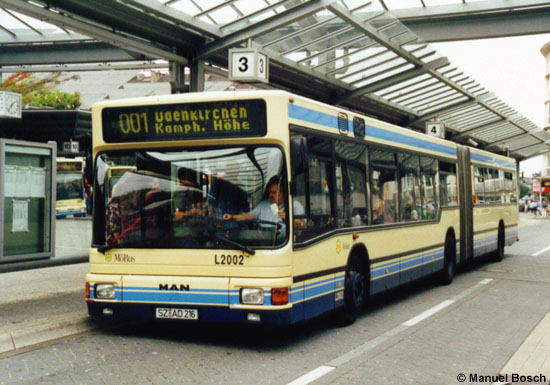 | Nach Leiheinsätzen in Bochum und Düsseldorf kehrte der im Jahre 2000 an den Hersteller MAN zurückgebene ehemalige Wagen 9461, ein MAN A11 (NG 272), mit der Zulassung SZ-AD 216 als Leihwagen L2002 im März 2002 zurück nach Mönchengladbach. Am 09.08.2002 wurde der Gelenkbus am Mönchengladbacher Hauptbahnhof im Einsatz als Linie 001 aufgenommen.