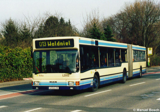Der frühere Wagen 9461 behielt nach der Rückgabe an den Hersteller seine Ursprungs-lackierung, so dass er im Leiheinsatz nur durch die ungewöhnliche Wagennummer und das abweichende Kennzeichen auffiel. Auf dem Weg nach Waldniel wurde der Wagen L2002 am 04.03.2003 an der Haltestelle Waldhausen Kirche im Bild festgehalten. | |