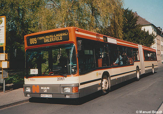 | Ebenfalls im Frühjahr 1997 folgte mit dem Wagen 2061 ein weiterer MAN A11 als Leihwagen. Der NG 272 war 1993 bei den Stadtwerken Mainz als Wagen 657 in Dienst gestellt worden, wurde nach einigen Einsatzjahren an den Hersteller zurückgegeben und nunmehr mit der Zulassung H-AY 3140 von MAN als Leihwagen eingesetzt. Die Aufnahme zeigt den Omnibus am 21.04.1997 im Einsatz auf der Linie 009 an der Haltestelle Casinogarten in Viersen. | |