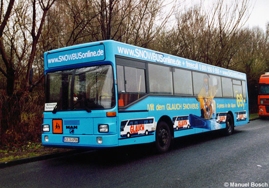 Im Schulbusverkehr setzt Glauch vier gebraucht beschaffte MAN SL 202 und zwei MAN A10 (NL 202) ein. Die Hochflurbusse sind mit auffälligen Werbebeschriftungen für Reiseangebote von Glauch versehen, wie der auf das Kennzeichen VIE-G 8700 zugelassene Wagen zeigt, der am 21.02.2006 in Nettetal-Lobberich pausierte. | |