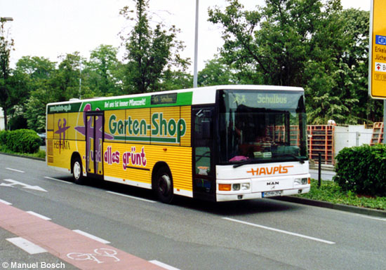 Im Jahre 1997 kam dieser MAN A20 der ersten Bauform mit hoher Fensterlinie und alter Frontpartie in den Fuhrpark der Firma Haupts und erhielt die Zulassung MG-MH 274. Seit einigen Jahren wird das Fahrzeug im Schulbusverkehr verwendet und erhielt zwischenzeitlich eine auch die Fenster umfassende Vollwerbung des Auftraggebers. Am 01.06.2007 war der Niederflurbus auf der Viersener Straße in Mönchengladbach unterwegs. | |