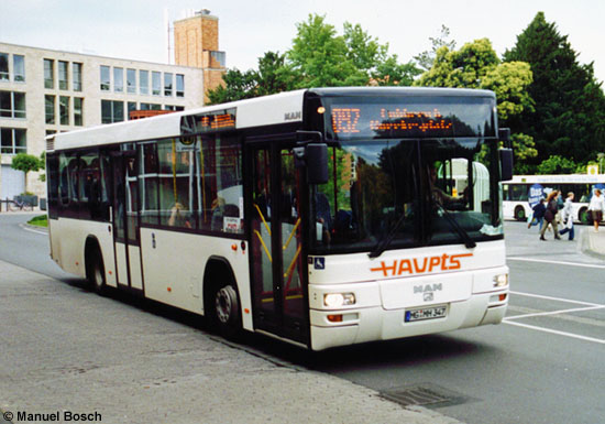 | Im Sommer 2006 stellte Haupts für die Linienauftragsverkehre mit zwei MAN A78 die ersten Omnibusse der Low-Entry-Bauart am linken Niederrhein in Dienst. Das Fahrzeug mit der Zulassung MG-MH 347 verlässt am 31.05.2007 den Viersener Busbahnhof als Linie 092. | |