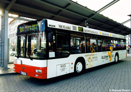 Die Kraftverkehr Gerresheim KG (KVG) mit Sitz in Jüchen im Kreis Neuss bedient im Auftrag der Mönchengladbacher NVV die Linien 090, 091, 097 und 098, wobei die KVG bei den letzteren drei auch Mitkonzessionär ist. Im Liniendienst werden ausschließlich EvoBus MB O 530 Ü (Citaro) und MAN A20 eingesetzt, darüber hinaus stehen jeweils ein EvoBus MB O 530 K, O 550 H, O 350-15 RHD und ein Teamstar City für Gelegenheits- und Schulbus-verkehre zur Verfügung. Mit Baujahr 2000 zu den ältesten vorhandenen Fahrzeugen gehört der MAN A20 mit dem Kennzeichen NE-M 9669, der am 23.02.2001 am Mönchengladbacher Hauptbahnhof angetroffen wurde. | |