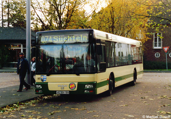 Jeweils zwei MAN A21 und A23 werden von der KVS eingesetzt, die in den Jahren 2000 und 2001 gebaut wurden. Das älteste dieser Fahrzeuge ist der MAN A21 mit der Zulassung VIE-BV 109, der am 23.11.2001 soeben den Busbahnhof in Viersen-Süchteln errreicht hat. | |