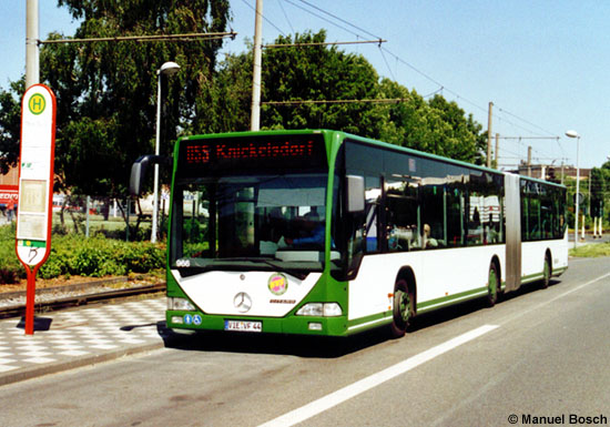 Seit dem Jahr 2001 wurden neue Linienbusse durch die KVS ausschließlich bei Mercedes-Benz beschafft, so dass sich inklusive mehrerer Gebrauchtkäufe inzwischen elf EvoBus MB O 530 (Citaro) und acht O 530 G im Bestand des Unternehmens befinden. Zu den letzten noch in der alten Bauform mit Euro 3-Motor ausgelieferten Fahrzeugen seiner Bauart gehört der im September 2006 beschaffte Gelenkbus mit dem Kennzeichen VIE-VF 44, der am 30.05.2007 an der Haltestelle TEW Tor 3 in Krefeld die aktuelle Farbgebung der KVS präsentiert. | |