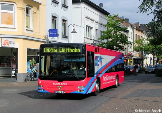 Mit Umfirmierung von NVV und niederrheinwerken in NEW wurden auch in Viersen mehrere Omnibusse mit einer Vollwerbung für den neuen Unternehmensauftritt versehen. Die Reklame bezieht Front und Fensterflächen der Fahrzeuge ein. Der MAN A21 (NL 273 Lion's City) mit der Wagennummer 37 befährt am 19.05.2012 die Hauptstraße in der Viersener Innenstadt.