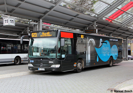 Der als Wagen 0904 eingereihte EvoBus MB O 530 (Citaro) erhielt im Juli 2011 die Vollwerbung für "Reuter Badshop", die wenig zuvor nach nur kurzer Belegungsdauer von dem typgleichen Wagen 0805 entfernt worden war. Nun wurde allerdings die Dachkante ebenfalls schwarz be- klebt, während der rote Balken über dem Fahrerfenster erhalten blieb. Am 29.10.2011 stand der Bus am Mönchengladbacher Hauptbahnhof bereit.