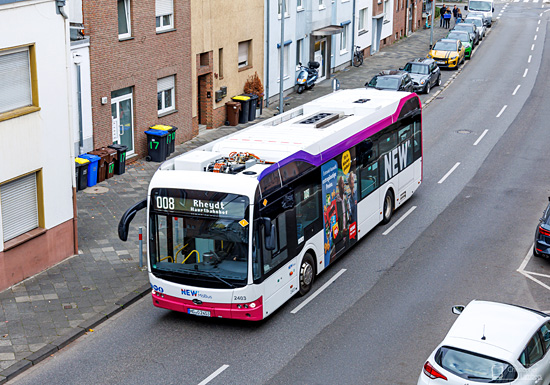 (n.de) Zahlreiche Werbungsänderungen waren in den vergangenen Wochen bei der NEW mobil und aktiv Mönchengladbach GmbH zu verzeichnen. Anfang Februar wurden zunächst die Werbungen für "NEW Weihnachten" auf den BYD K9UD entfernt - bei den Wagen 2412 bis 2414 das fahrerseitige 18/1-TrafficBoard, bei den Wagen 2409 und 2411 die rundum angebrachten Beklebungen, so dass sich diese Fahrzeuge seither auch ohne die vorher vorhandenen "Elektrobus"-Aufschriften zeigen. Erst im Februar verlor auch der EvoBus MB O 530 C2 (Citaro) mit der Wagennummer 1507 das fahrerseitige 4/1-TrafficBoard für das "37. Jazz-Festival Viersen", das bereits im September vergangenen Jahres stattgefunden hatte. Neutralisiert wurde zudem bei dem als Wagen 2102 eingereihten EvoBus MB O 530 C2 Hybrid (Citaro) das 18/1-TrafficBoard auf der Fahrerseite für "Malteser Menüservice".
