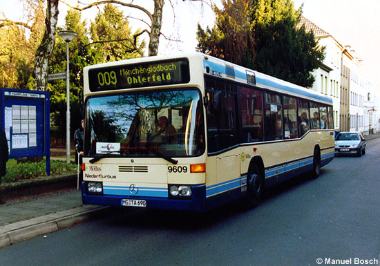 | Als diese Aufnahme des EvoBus MB O 405 N2 mit der Wagennummer 9609 am 04.01.2005 an der Haltestelle Casinogarten in Viersen entstand, hätte es eine der letzten Möglichkeiten sein sollen, die Linie 009 auf Viersener Stadtgebiet beobachten zu können. Seit dem 01.02.2005 können hier morgens und mittags wieder Fahrten der Linie 009 angetroffen werden. |