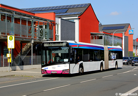 Mit der Umsetzung des derzeit aktuellen Nahverkehrsplans wurde die Mönchengladbacher Linie 002 von Eicken bis nach Bettrath verlängert. Die Vorstudie zur Fortschreibung des Plans konstatiert für diesen Abschnitt nun eine moderate Nachfrage und hinterfragt damit indirekt die Sinnhaftigkeit der Umlegung einer Gelenkbuslinie auf diesen Abschnitt. Davon unbeeindruckt war am 23.07.2022 der Solaris Urbino 18 mit der Wagennummer 1667 der NEW am Spielkaulenweg auf dem Weg stadteinwärts.