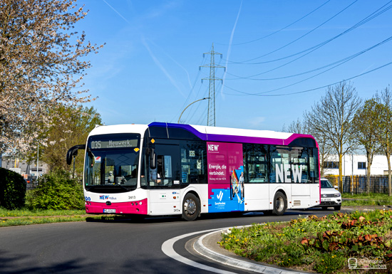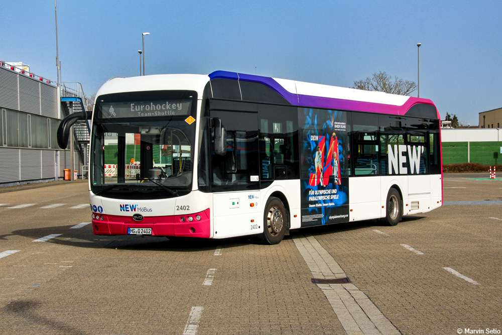 (n.de) Zahlreiche Werbungsänderungen waren in den vergangenen Wochen bei der NEW mobil und aktiv Mönchengladbach GmbH zu verzeichnen. Anfang Februar wurden zunächst die Werbungen für "NEW Weihnachten" auf den BYD K9UD entfernt - bei den Wagen 2412 bis 2414 das fahrerseitige 18/1-TrafficBoard, bei den Wagen 2409 und 2411 die rundum angebrachten Beklebungen, so dass sich diese Fahrzeuge seither auch ohne die vorher vorhandenen "Elektrobus"-Aufschriften zeigen. Erst im Februar verlor auch der EvoBus MB O 530 C2 (Citaro) mit der Wagennummer 1507 das fahrerseitige 4/1-TrafficBoard für das "37. Jazz-Festival Viersen", das bereits im September vergangenen Jahres stattgefunden hatte. Neutralisiert wurde zudem bei dem als Wagen 2102 eingereihten EvoBus MB O 530 C2 Hybrid (Citaro) das 18/1-TrafficBoard auf der Fahrerseite für "Malteser Menüservice".
