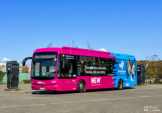 (n.de) Auch in diesem Jahr hat die NEW mobil und aktiv Mönchengladbach GmbH wieder Fahrzeuge mit Beklebungen zur "EuroHockey Championships" versehen lassen. Der BYD K9UD mit der Wagennummer 2409 erhielt Anfang April eine entsprechende Vollwerbung, die baugleichen Wagen 2410 bis 2414 ein fahrerseitiges 18/1-TrafficBoard. Die Aufnahmen von Christopher Lambers zeigen den Wagen 2409 auf dem Betriebshof und den Wagen 2413 am 08.04.2025 am Kreisverkehr Willicher Damm/Nordring.