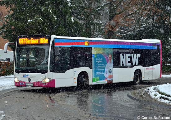(n.de) Bei der NEW mobil und aktiv Viersen GmbH erhielten die EvoBus MB O 530 C2 (Citaro) mit den Wagennummern 40 und 58 ein fahrerseitiges 18/1-TrafficBoard für "NEW Weihnachten", womit beim Wagen 40 das bislang angebrachte 18/1-TrafficBoard für "Vielfalt tut gut!" ersetzt wurde. Cornel Nußbaum konnte den Wagen 40 am 12.12.2025 kurz nach Verlassen der Endhaltestelle Bockert Kreuz im Bild festhalten.